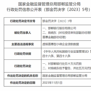 邯郸监管分局决定对邯郸银行罚款50万元,对责任人施晓东给予警告并罚款5万元。