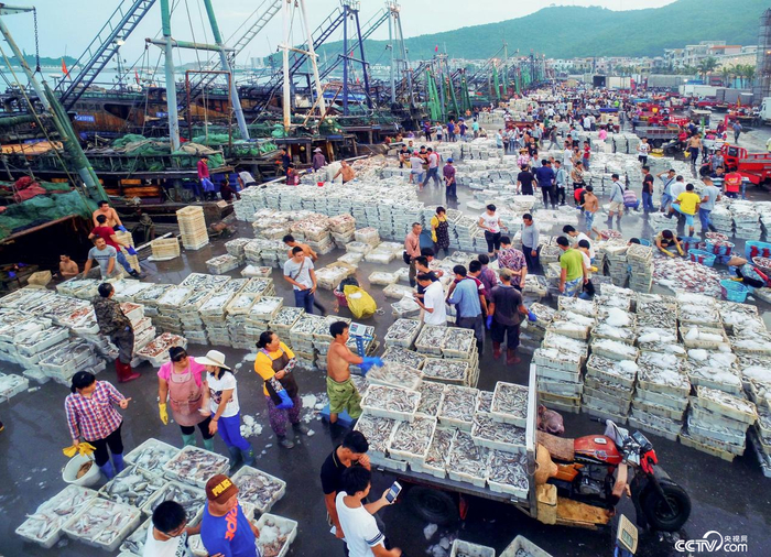 渔港上正在进行繁忙的海产交易