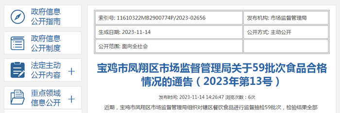 陕西省宝鸡市凤翔区市场监督管理局关于59批次食品合格情况的通告(2023年第13号)