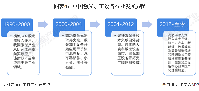 20世纪90年代,横流CO2激光器投入使用,标志着我国激光产业从研究成果开始走向实际应用。20世纪90年代,激光设备大量应用于轻工业领域。21世纪初,成套的大功率激光设备面市,2007年,武汉锐科激光成立,通过技术研发打破了光纤激光器领域技术依赖与价格垄断,填补了国内空白,迫使同类进口产品价格下降50%。“十二五”时期以来,我国激光器关键技术取得突破,大功率激光切割机、激光直接成型机、用于微电子加工等领域的激光设备开始广泛应用,中国激光加工设备市场份额已达国际领先。