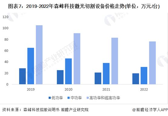光纤激光切割设备可根据功率分为低功率(3KW 以下,不含 3KW)、中功率(3-6KW,不含 6KW)和高功率及超高功率(6KW 及以上)多种型号,功率越大,单价越高。以森峰科技为例,2019-2022年,各类功率型号产品单价均呈现出逐年下降的趋势,主要系国产化程度的提高,激光器价格下降,导致激光切割设备价格下跌。