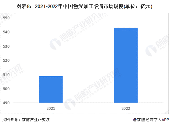 中国激光市场整体起步较晚,但随着国内企业突破激光器核心技术,实现激光器和核心光学器件的规模化生产,推动光学原材料成本下降,国内激光设备的需求呈现爆发式增长。根据《2022年中国激光产业发展报告》,2021年中国激光设备行业市场销售额约820亿元。2022年中国激光设备销售收入突破870亿元,同比增长6.7%。根据在材料加工领域激光设备市场占比,得到2021年中国激光加工设备行业市场规模为510亿元左右,2022年为540亿元左右。
