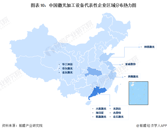 从激光加工设备行业代表性企业来看,我国的激光加工设备优势企业主要分布在沿海区域和华中地区,其中广东地区代表性企业数量最多,且我国激光加工设备的龙头企业大族激光也注册在广东。目前我国激光加工设备行业呈现明显区域集中现象。