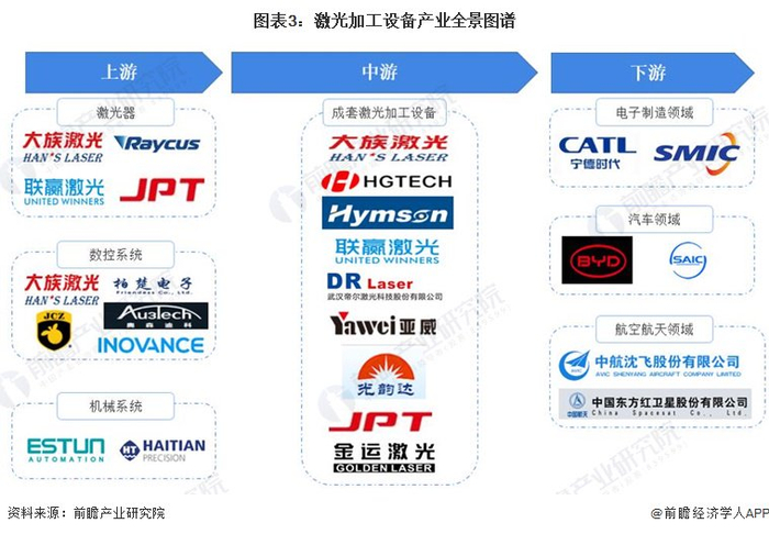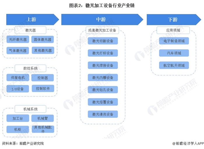 激光加工设备产业链的上游主要有激光器、数控系统以及机械系统等一系列集成系统。中游为成套激光加工设备生产商。下游为电子制造领域、汽车领域以及航空航天领域等一系列应用领域。