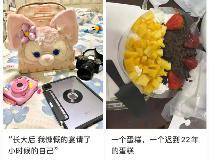 于是,被“求而不得”的遗憾伴随长大的成年人,在社交平台上发起“宴请小时候的自己”的话题,用自己赚的钱慷慨地满足一次自己小时候的心愿。