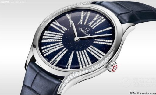 欧米茄采用Canopus™18K金打造了这枚碟飞系列名典女士手表,表壳直径36毫米,表壳两侧镶嵌有38颗长阶梯形切割钻石,迷人曲线,尽显优雅。这款手表搭配深蓝色砂金石表盘,采用“大明火”珐琅工艺制成,并饰以经钻石抛光的白色18K金指针。白色18K金罗马小时刻度表面共铺镶262颗钻石。一款精美时计,经过材质和设计的加持,成为永恒。