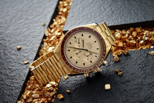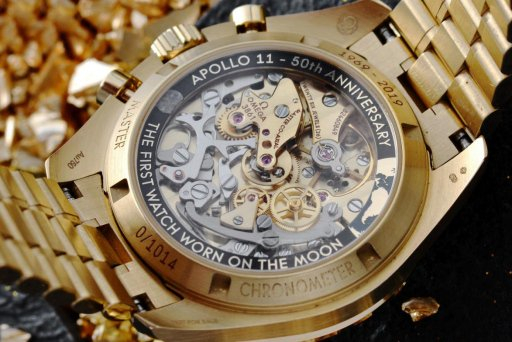 在2019年,欧米茄为纪念人类首次登月50周年,隆重推出了超霸系列“阿波罗11号”50周年纪念限量版腕表Moonshine18K金款,限量发行1,014枚。手表的表壳、表链、表盘及时针分针均采用Moonshine18K金打造。