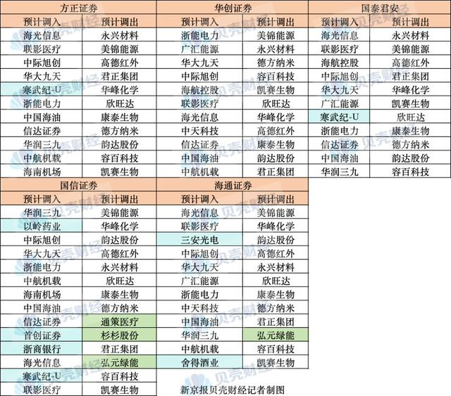 贝壳财经记者梳理发现,多家券商预测,此次沪深300指数调入和调出个股分别在11只-14只之间。
