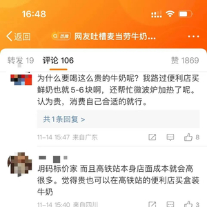 有人认为这么贵的牛奶完全没有喝的必要,“我路过便利店买鲜奶也就五六元,还帮忙微波炉加热”“为啥要去麦当劳点牛奶,图它热得快?”;也有人觉得只要明码标价就行,买不买看个人选择。