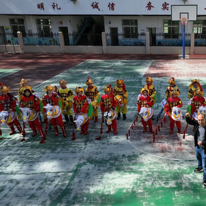 “喂!喂!喂!”操场上,身着红、黄战袍的竹马队伍鱼贯而来,他们持马鞭、背战旗,变换着队形,时而集合,时而散开,配合着音乐的鼓点霍然而舞,酷似古代骑兵,个个英姿飒爽、神采奕奕,数十人便营造出千军万马冲锋鏖战的激烈气氛,再现了《杨门女将》中的精彩片断。