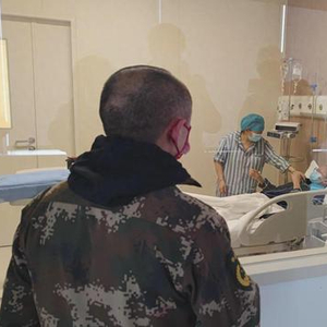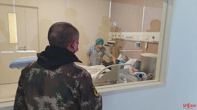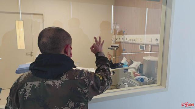 “儿子加油!”15日,在移植仓外的探视通道,马行军隔着玻璃,给儿子加油鼓励。医生建议刚刚采集了外周血造血干细胞的他休息两天后,再进仓和妻子“换岗”陪护。