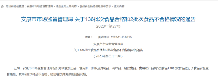陕西省安康市市场监督管理局关于136批次食品合格和2批次食品不合格情况的通告(2023年第二十一期)