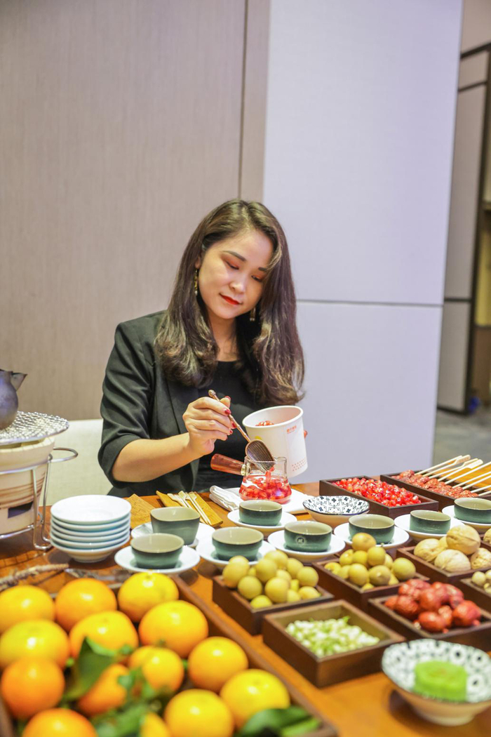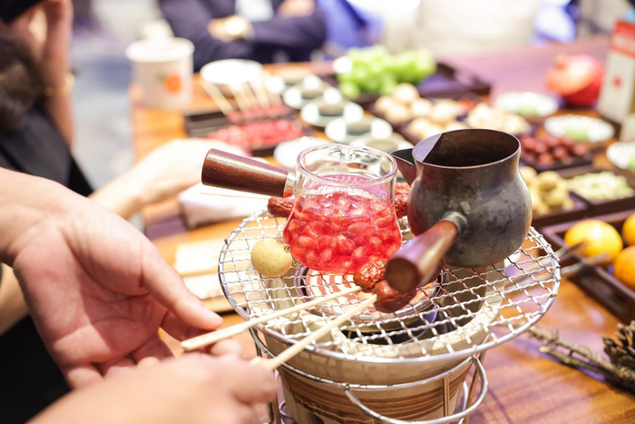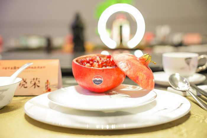石榴,果粒酸甜可口多汁,营养价值高,含有维生素C及B族维生素,有机酸、糖类、蛋白质、脂肪及钙、磷、钾等矿物质。对于饮酒过量的人,石榴还有解酒的功效。石榴与红茶一起慢煮,祝愿现场各位嘉宾染尽霜华,心中依旧温暖如初。
