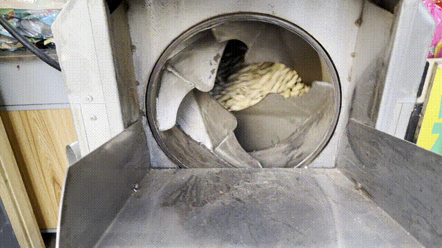 店内的炒货机360度不断翻滚着瓜子、花生、栗子,炒完一筐又一筐。炒完后,店家将坏籽瘪籽一一剔除,保证每颗坚果粒粒精选、颗颗饱满。翻炒过后的坚果焦香悠长,捧一把在手心还能感受到余温,一股暖暖的幸福感涌上心头。