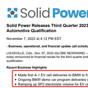 日前,美国固态电池技术开发商Solid Power, Inc.在公司第三季度财务报告中宣布,其首批A样品电池已进入装车验证阶段。