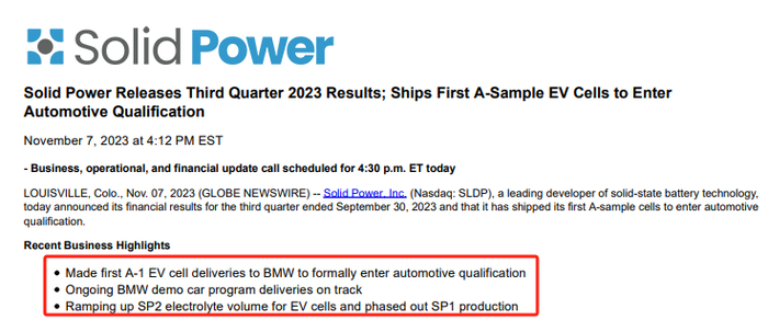 新闻稿写道,Solid Power已经向宝马公司交付了第一批A-1电动汽车电池,并透露宝马方面演示车项目的交付已步入正轨,这意味着公司的固态电池正式进入了装车验证阶段。