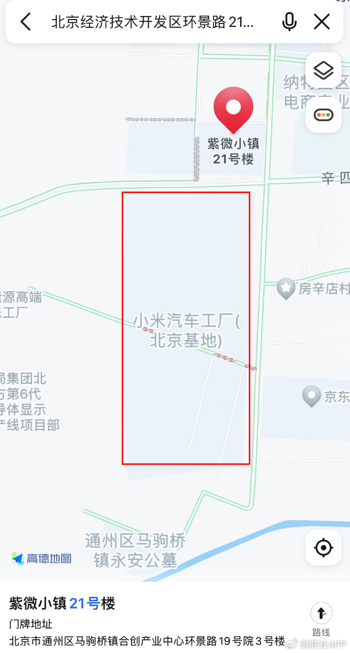 另外,根据申报信息显示,小米汽车生产地址为北京市北京经济技术开发区环景路21号院。通过查询高德地图发现,该地址应为小米汽车工厂(北京基地)所在地。