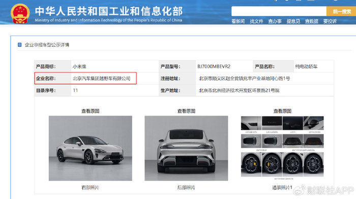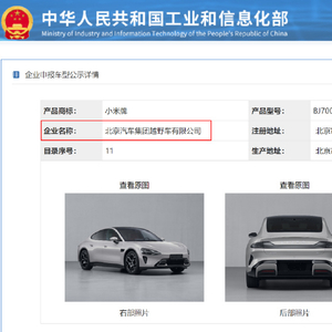 然而工信部网站信息显示,小米汽车产品商标为“小米牌”,企业名称为“北京汽车集团越野车有限公司”,通过天眼查数据显示,北京汽车集团越野车有限公司为北京汽车集团有限公司的全资子公司。