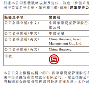 中国华融实施更名,有利于体现该公司深化改革、化险取得的积极成效,展现积极的精神面貌,树立全新的企业形象;有助于依托中信集团品牌价值,促进业务开展,进一步推动该公司高质量转型发展;也有利于突出该公司的行业特征与牌照优势,体现防范化解金融风险、维护金融体系稳定的功能定位,彰显企业价值。公告显示,有关建议变更公司名称的议案已经董事会审议通过,并将提呈公司股东大会审议批准。