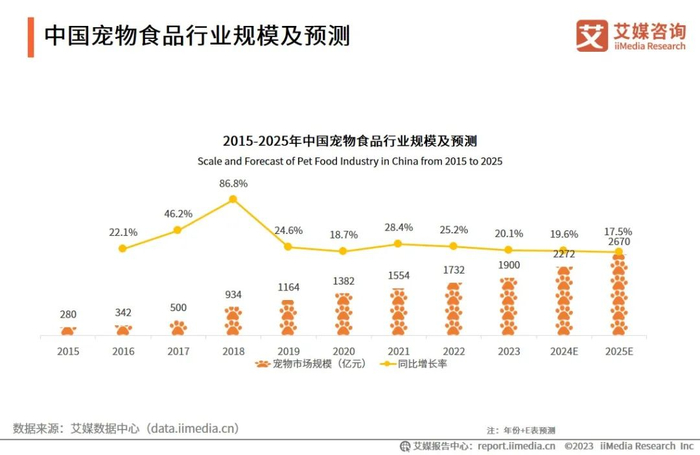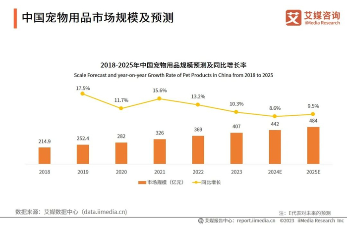 iiMedia Research(艾媒咨询)数据显示,2022年中国宠物经济产业规模达4936亿元,同比增长25.2%;2025年市场规模有望达到8114亿元。艾媒咨询分析师认为,随着人们对宠物角色的认知从情感寄托逐渐转变为家庭成员,他们在宠物身上的消费也在不断增加。这种趋势推动了宠物食品、用品、医疗、娱乐等各方面的消费增长,中国宠物经济产业将迎来广阔的增长空间。