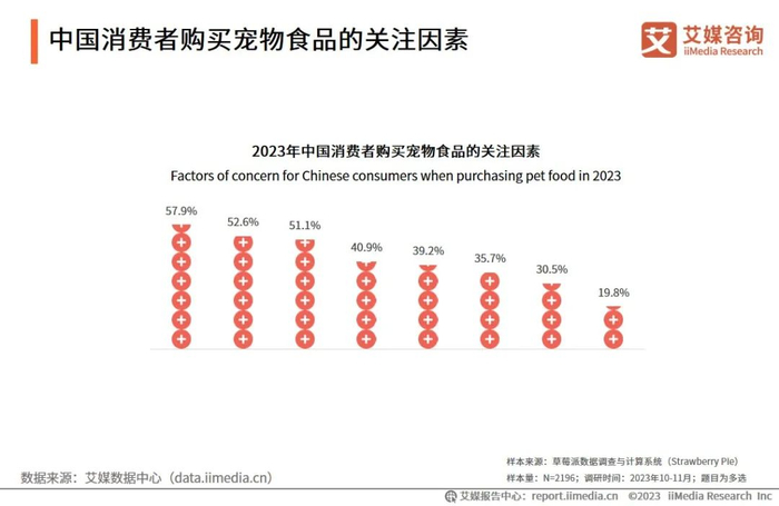 iiMedia Research(艾媒咨询)数据显示,中国消费者购买宠物食品的需求较多样化,在宠物食品关注因素中,消费者最为关注宠物的食用喜好,其次为产品原料和用户口碑。艾媒咨询分析师认为,随着宠物在人们生活中的地位逐渐提升,人们对宠物食品的质量要求也在不断提高,良好的品牌口碑将有助于增加消费者粘性及提高消费者复购率。