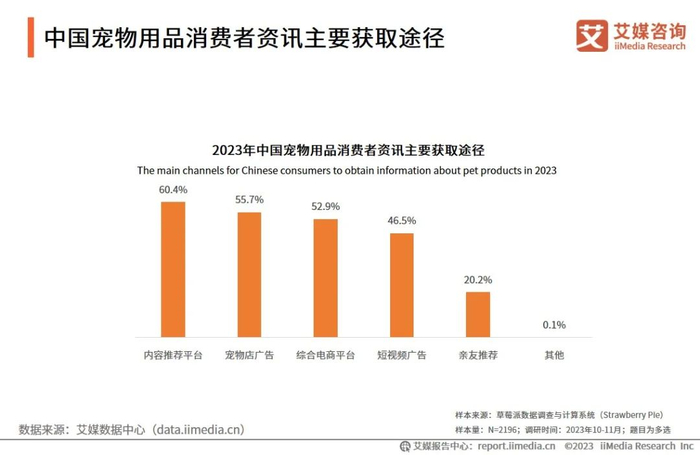iiMedia Research(艾媒咨询)数据显示,内容推荐平台的宣传(60.4%)、宠物店广告(55.7%)和综合电商平台推广(52.9%)是中国宠物用品消费者获取资讯的主要途径。艾媒咨询分析师认为,相比于线下亲友推荐,线上平台关于宠物用品的功能和用法的介绍更加清楚详细,消费者偏向于在线上平台获取宠物用品的信息。