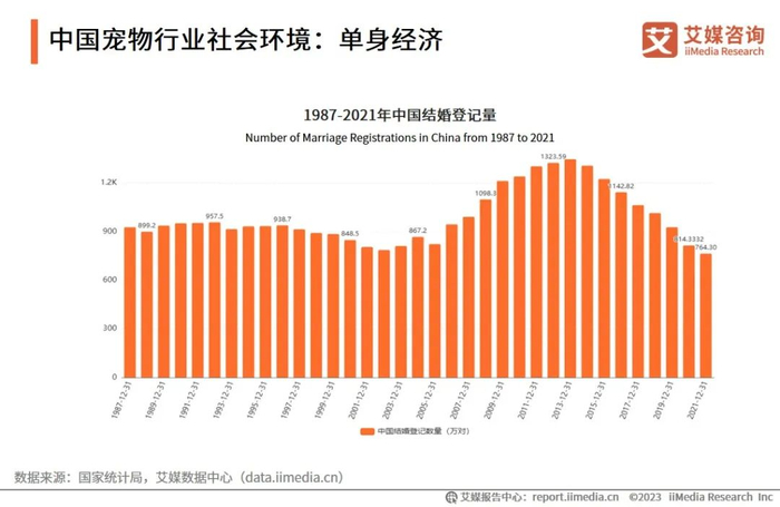 数据显示,自2013年后,中国结婚登记人数开始逐年下降。2021年全国结婚登记数为746.30万对,相比2020年减少了50万对。艾媒咨询分析师认为,快节奏的工作和生活间接影响着都市男女的单身比例。相对已婚人士,单身人士的消费能力较强。宠物具有陪伴的属性,单身经济是推动宠物行业发展的一大重要因素。