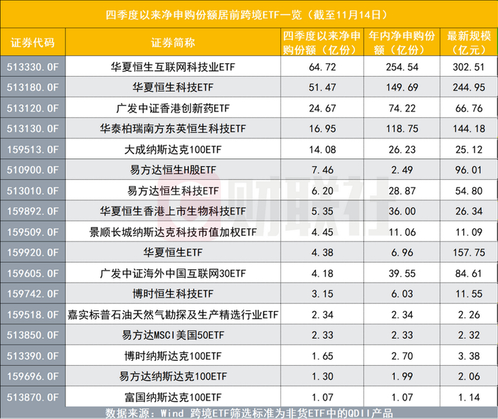 其次是华夏恒生科技ETF,四季度以来该ETF被净申购51.47亿份,截至11月14日,基金份额总额创新高至456.99亿份。