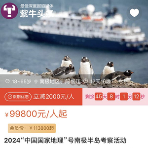 近日,有网友发现中国国家地理推出了一项南极科学考察旅行活动,售价约在每人10万元左右,该项活动一经推出,最近一期的活动名额已被抢完。