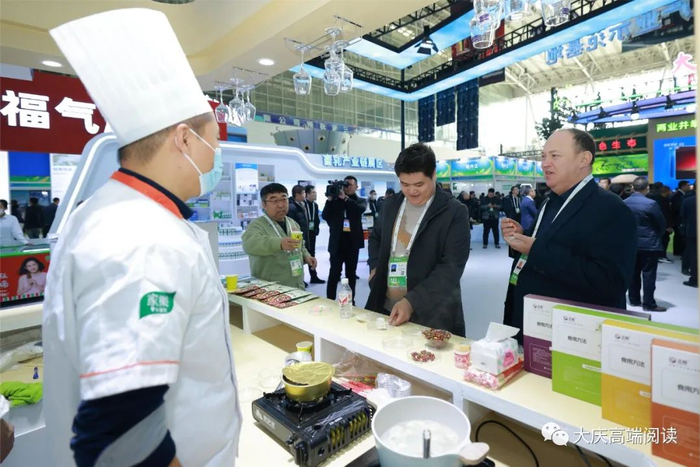 在伊利、蒙牛、惠丰、养可滋、大庆乳业、大庆红宝石、中农兴和生物科技等企业展示区及我市部分“黑土优品”品牌产品展台前吸引了不少的嘉宾和寻求合作的各地客商。