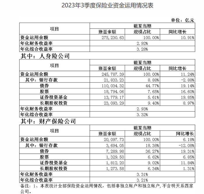 除了总资产、金融服务和偿付能力,日前,国家金融监督管理总局还披露了《2023年3季度保险业资金运用情况表》。数据显示,截至三季度末,保险资金运用余额为27.52万亿元,同比增长10.91%。三季度,保险资金的年化财务收益率为2.92%,年化综合收益率为3.28%。