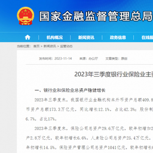 11月14日,国家金融监督管理总局发布《2023年三季度银行业保险业主要监管指标数据情况》。三季度末我国保险业总资产29.6万亿元,较年初增长9%;保险资金的年化综合收益率为3.28%。