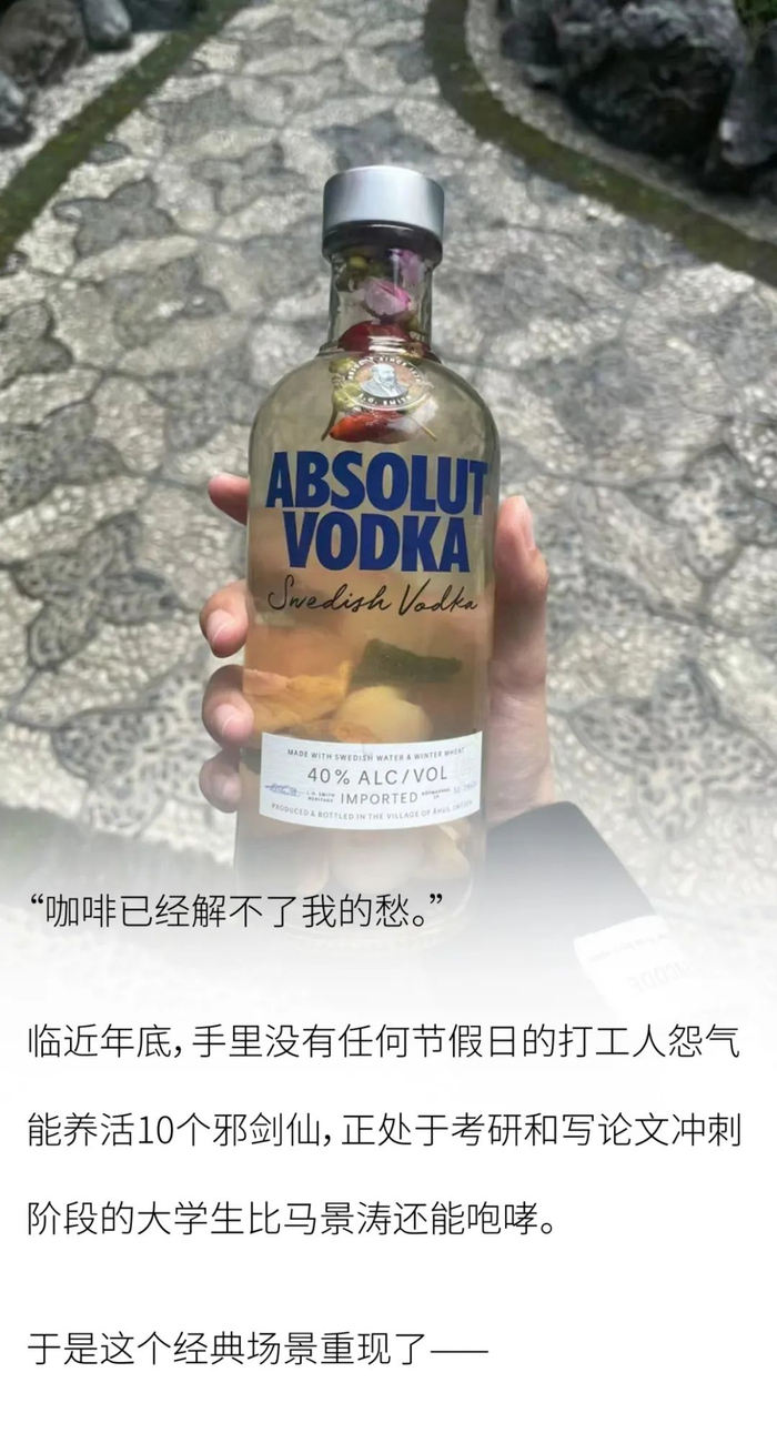 与之类似的还有最近正在冲刺的考研人。几年前是在自习室一道肖四一口酒,现在一瓶雪花已经解不了秀荣的愁了,想到过几天就要面对“最难考研年”,所以不如索性换成伏特加。