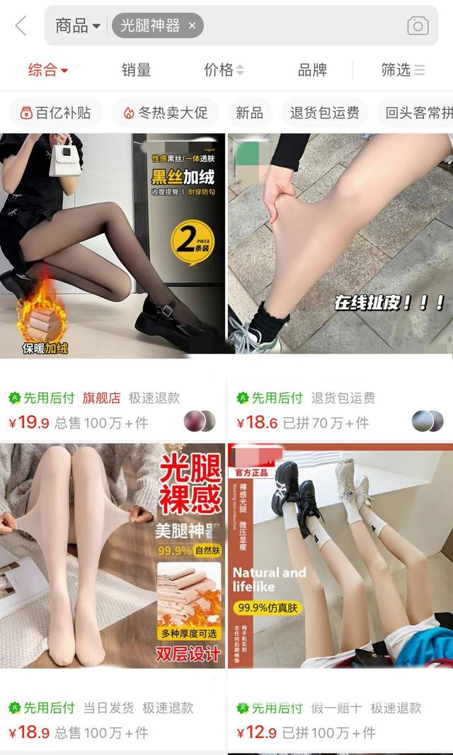 随着冬季降温,“光腿神器”的人气也水涨船高,价格从几十元到几百元不等,电商平台上不少店铺的销量都达到了10万+,销售量最高的已经超过100万件。