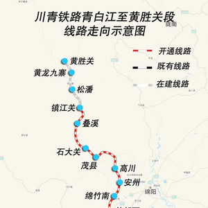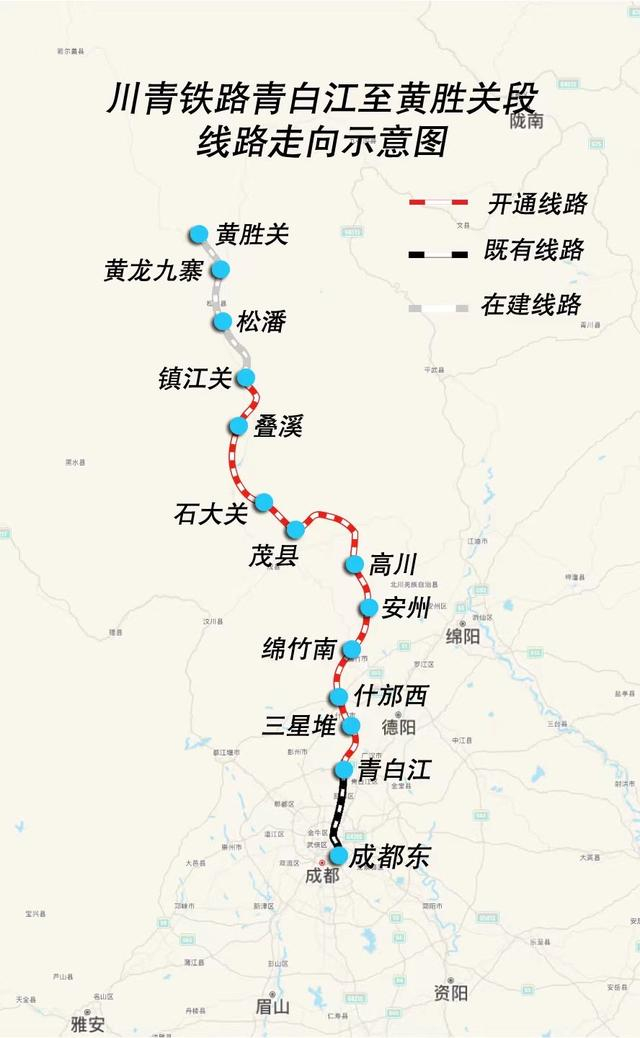 据成兰指挥长肖霞林介绍,川青铁路青白江至镇江关段设计时速200公里,为国家Ⅰ级双线铁路。全线共设10个车站,分别为青白江、三星堆、什邡西、绵竹南、安州、高川、茂县、石大关、叠溪和镇江关站,其中青白江为既有车站,其余为新建车站。新建车站中,石大关和叠溪是用于技术作业的越行站,不办理客运业务。