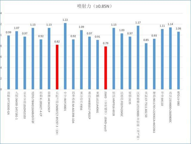 喷射力和平均喷射角最能直接反映使用者的体验情况。根据试验结果,喷射力方面,有2款样品未能达到标准要求的≥0.85N,分别是售价384元标称长虹卫浴 ZWB0727-BY297-3(CH)和售价596.7元JSWD(京世威登)JSWD-ysyz3,喷射力不足有清洁效果差、耗时耗水、维护成本高的缺点;喷射角方面,标称长虹卫浴 ZWB0727-BY297-3(CH)的样品未能达到0°- 8°的要求,该型号产品不能带来良好的使用体验。