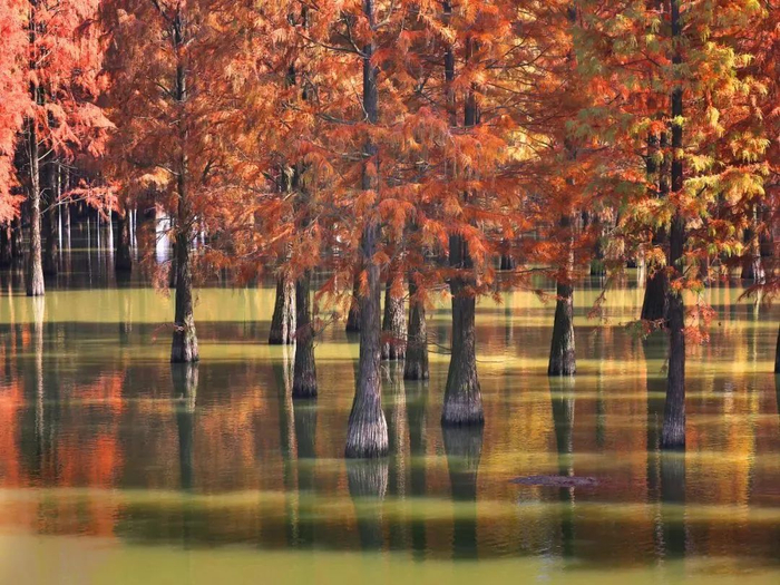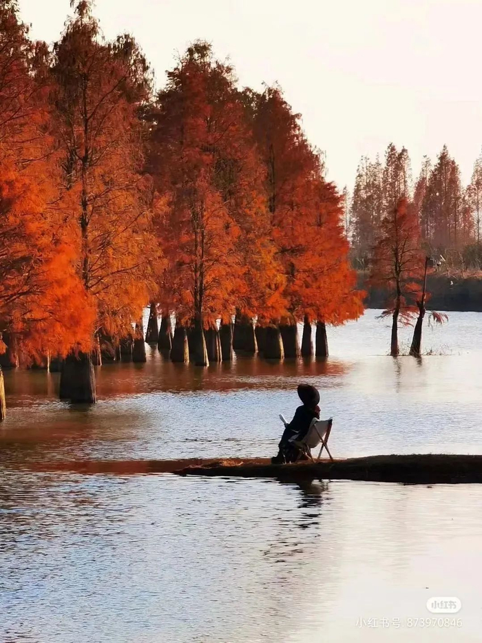 行走在湖畔,落叶铺就了美丽的彩色大道,脚下碧波荡漾,红杉倒映湖面。高大细密的水杉,穿梭在潋滟的秋色里,展露出最“燃”的模样。