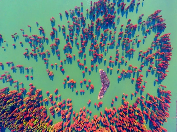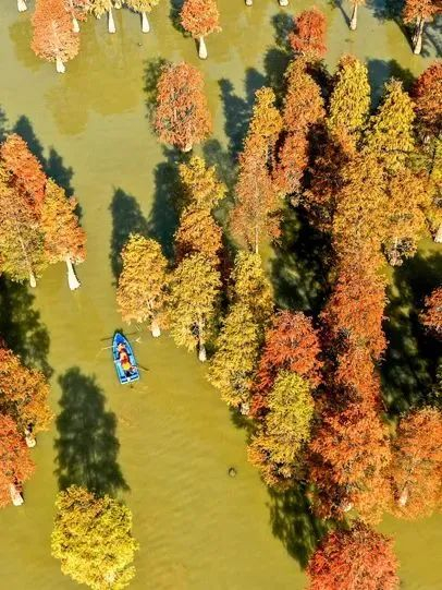 大汉塘的水杉林迎来了一年中最佳的观赏期。占地面积300余亩的大汉塘,栽种约2万株水杉树,初冬时节,红杉林层林尽染,红锈、橘黄、橘红等色彩,从高处俯瞰,美得令人窒息。