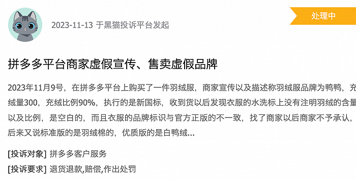 除了官方点名,黑猫投诉上来自用户的投诉也不在少数。譬如有人曾在黑猫投诉上投诉鸭鸭羽绒服的产品网上销售没有控价,花399元买的一件羽绒服,结果不到1个月就降价100元。还有更多的人称鸭鸭羽绒服的质量与描述不相符、相关店铺服务人员的态度敷衍等,鸭鸭的抖音店铺、拼多多店铺、天猫店铺等电商平台的店铺都在消费者的投诉之中。