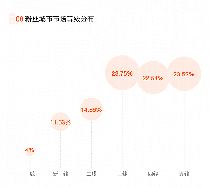 在其直播间的八大消费人群中,占比最高的是精致妈妈,占比22.2%,其次是小镇青年21.8%;genz和新锐白领以及资深中产合集占比达到40%,(所谓的genz指的是Z世代,即1995-2005年之间出生的青少年)。直播间观众也以新一线、一线和二线城市最多,占比超过了50%。