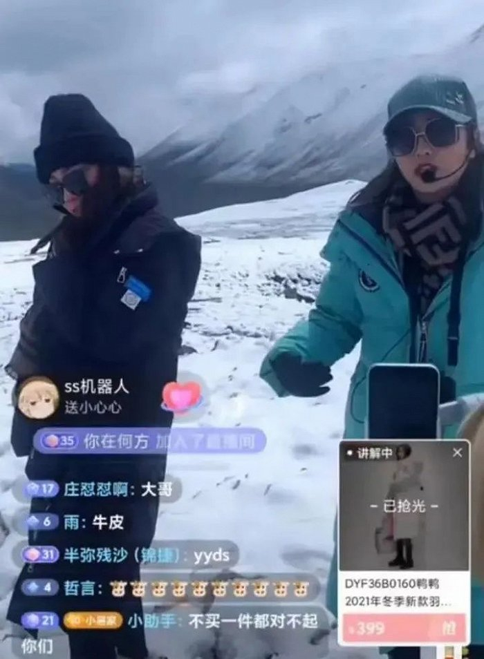 入驻抖音后,鸭鸭最先做的是用达播打响知名度和市场。2020年,鸭鸭尝试抖音自播,但并未有太高声量。2021年8月,鸭鸭将直播间搬到雪山上,主播一边吸着氧气一边直播卖羽绒服,一夜涨粉30万。
