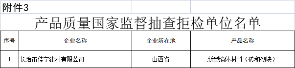 (三)拒检情况。本次抽查中,山西省长治市佳宁建材有限公司违反《产品质量法》规定,无正当理由拒绝接受监督抽查(详见附件3)。