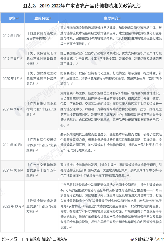 近年来,广东省发布了多项关于农产品冷链物流建设的利好政策,包括《促进食品冷链物流发展若干措施》、《关于支持省级现代农业产业园建设政策措施》、《广东省推进农业农村现代化“十四五”规划》、《推进冷链物流高质量发展“十四五”实施方案》等。