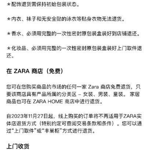 中国经济周刊—经济网讯 据界面新闻报道,近日,ZARA在线下门店收银台树立了标牌告知顾客,自2023年11月27日起,其线上订单退货政策变更。从11月27日开始,消费者通过ZARA官网、APP和小程序购买的商品,可以通过“上门取货”或“丰巢柜”方式退货。ZARA实体店将不再提供来自ZARA官网、App、小程序订单的退货服务(部分商品除外),与天猫和抖音的在线订单保持一致。