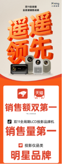 2023年双11圆满结束,LCD投影行业的领导品牌小明投影品牌(以下简称“小明”)大放异彩,获得京东、天猫平台单LCD投影销售额第一、抖音平台全周期LCD投影品牌机销售量第一,同时成为京东投影仪品类明星品牌。