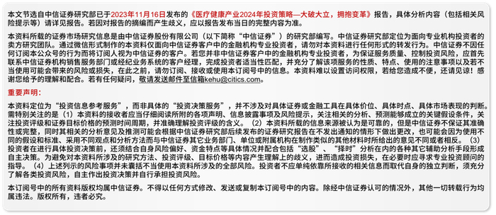 ②眼科耗材:行业远期空间广阔、国产替代加速在即,内资厂商有望持续实现国产替代。受到消费环境疲软的影响,今年角膜塑形镜的销售略微承压,随着客观因素的影响逐渐减弱以及消费环境逐渐复苏,我们判断2024年角膜塑形镜的销售恢复快速增长值得期待。