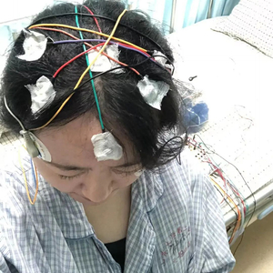 ▲史嘉茵接受小睡试验,头部贴满电极。受访者供图