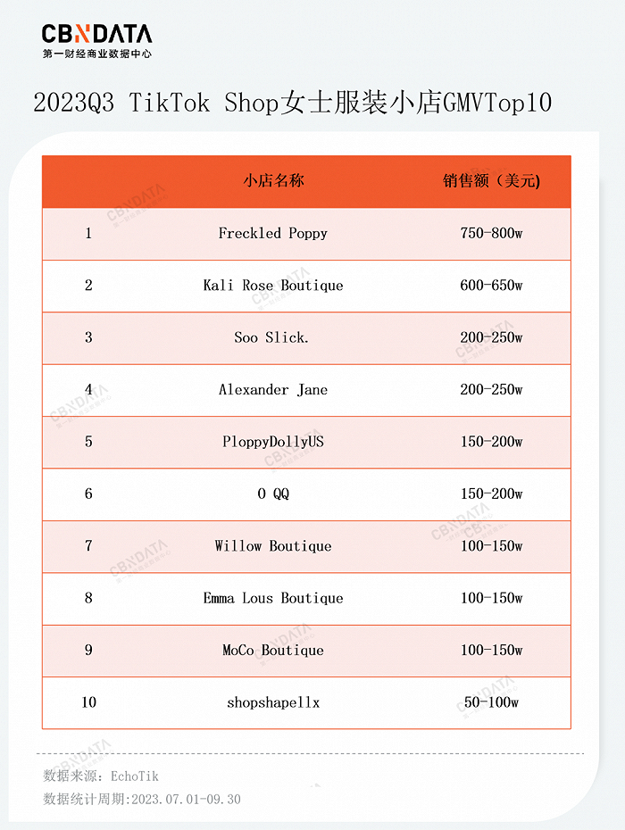 整体来看,护理与美容与女士服装仍然是TikTok平台的头部品类,表现出色的小店多数为DTC中小品牌或白牌商品的集合店,产品以高性价比为主要卖点。例如《TikTokShop美国第三季度发展趋势报告》显示,第三季度女士服装热销小店TOP10中,多数上榜小店商品均价在30-50美元(约为220-360元人民币)左右;从热销产品的类型来看,以基础款服装和牛仔服装居多,如牛长裤、纯色工字背心、纯色连体上衣等。