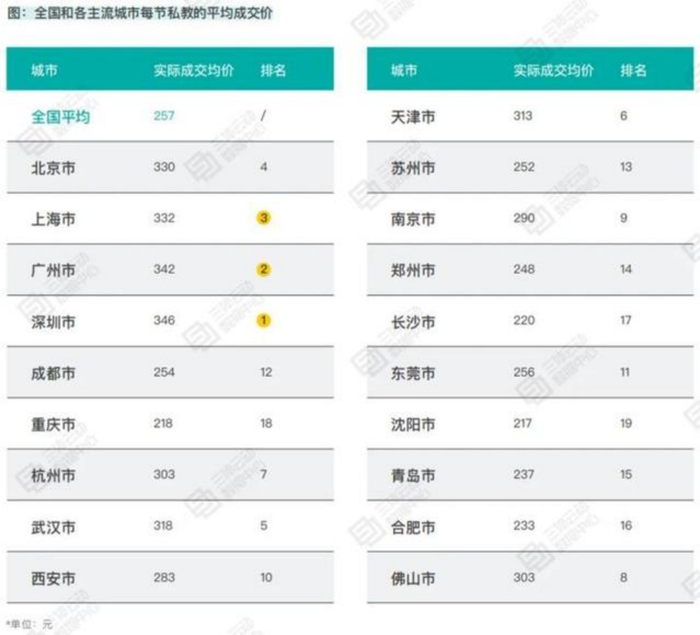 数据统计上没那么夸张,但也很高了,比如深圳和广州的私教课可达到340元以上。
