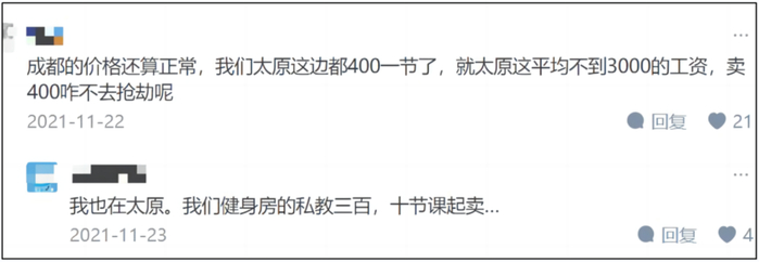 “我们太原这边都400一节了,就太原这平均不到3000的工资,卖400咋不去抢劫呢”。